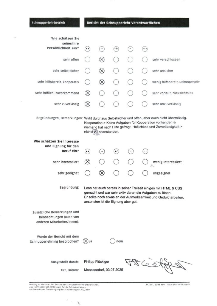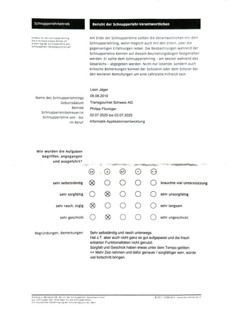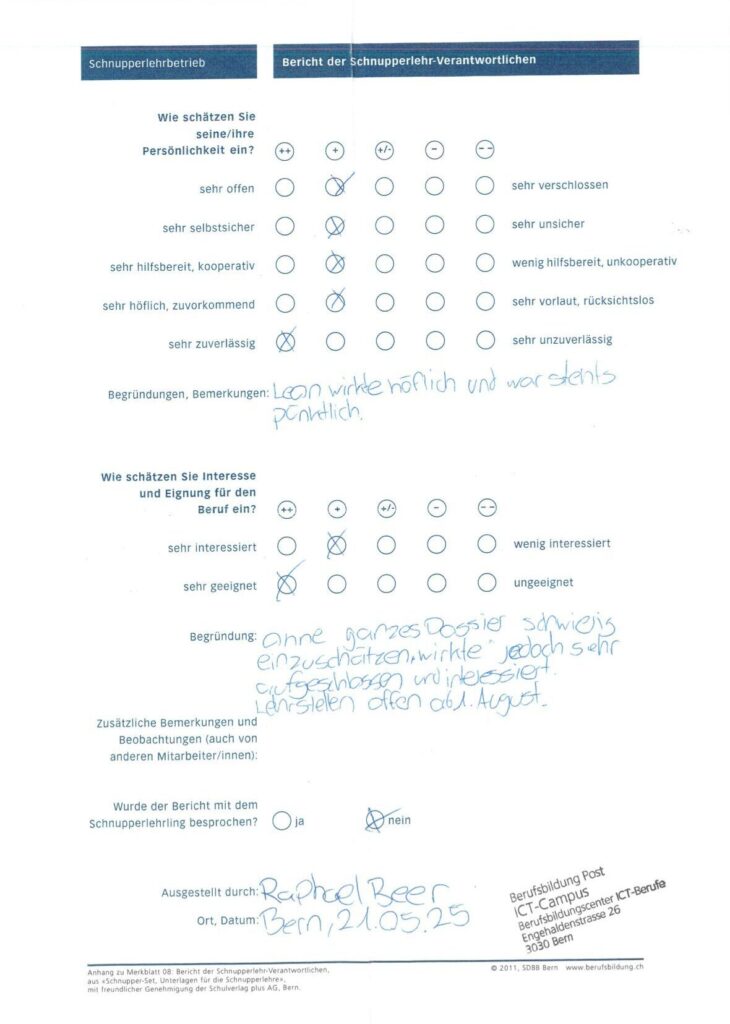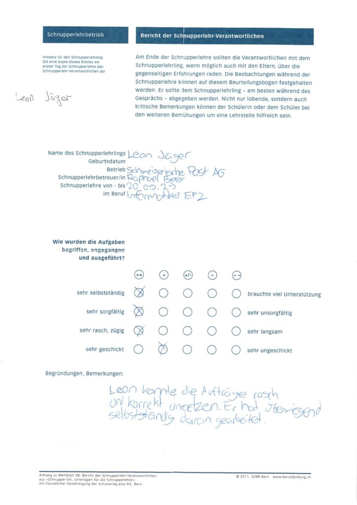 Während meinen Schnuppertagen in Zofingen und Bern konnte ich einen sehr positiven Eindruck vom Berufsbild und der Ausbildung bei der Post gewinnen. Die spannenden Aufgaben und das freundliche Umfeld haben mir gezeigt, dass das genau das Richtige für mich ist und meinen Wunsch, Informatiker zu werden, noch verstärkt.